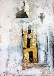Turm Biocca, 2004, Fotopapier, Lehm, Blei, Acryl auf Holz, Bleiflugzeug Photographic, 88 x 63 cm