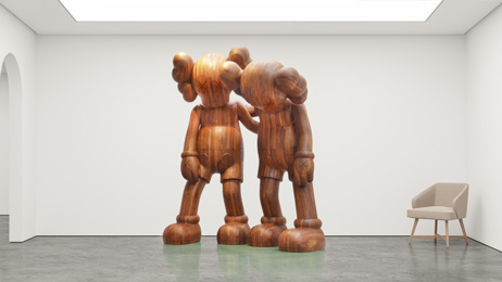 Die überlebensgroße Skulptur ALONG THE WAY zeigt zwei dieser Compagnion-Figuren mit den typischen ausgeXten Augen. Das Paar hält die Köpfe gesenkt und spendet sich gegenseitig Trost. Mag das Motiv auch an Kinderspielzeug erinnern, entwickelt es doch durch seine Haltung eine tiefere, ja geradezu erwachsene Dimension. Die monumentale Skulptur wurde kürzlich durch die Galerie verkauft und befindet sich nun in einer bedeutenden deutschen Sammlung.